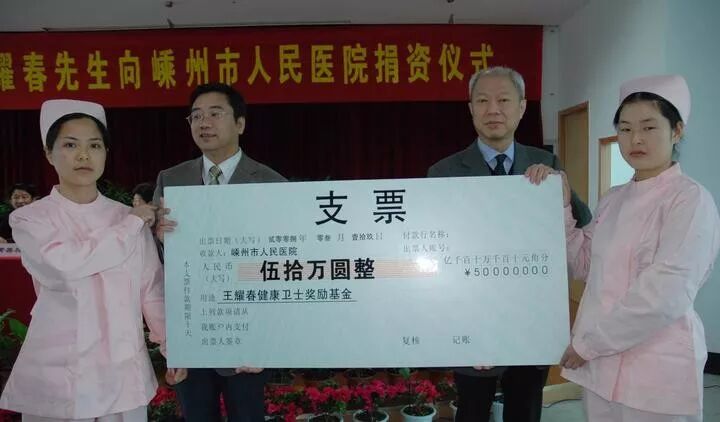 当年3月,76岁的王耀春因为患病来不了嵊州,他特意委托自己的表外甥、 著名港商詹耀良,带着一张50万元的现金支票送给了医院。